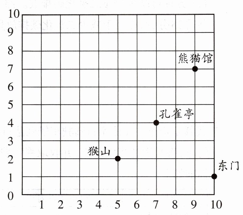 1. 猴山的位置用(5,2)表示,请你在图上标出金鱼湖(6,6)、盆景园(3,8)、北门(2,10)的位置。