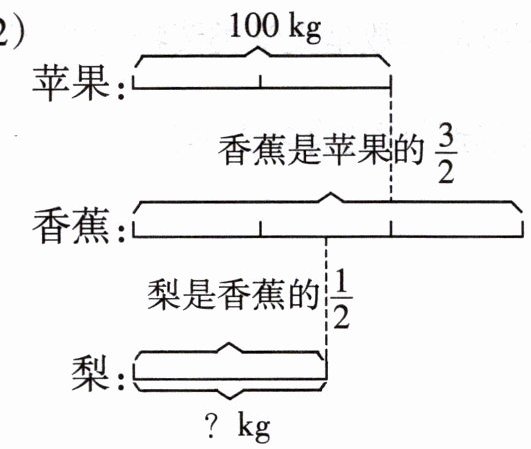 解析:考查分数的连乘应用。已知苹果重量为$100kg$,香蕉是苹果的$\frac{3}{2}$,梨是香蕉的$\frac{1}{2}$,求梨的重量。