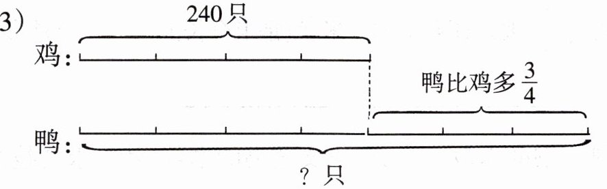 解析:考查分数乘法的应用。已知鸡有$240$只,鸭比鸡多$\frac{3}{4}$,求鸭的数量。