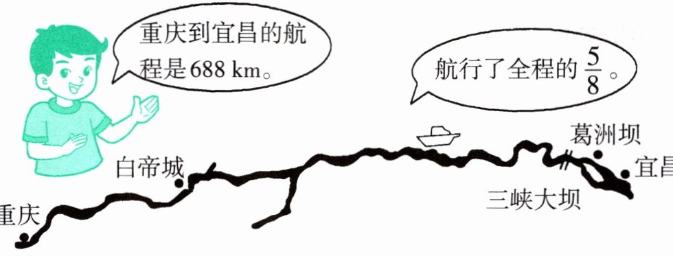 已知重庆到宜昌的航程是$688$千米,已经航行了全程的$\frac{5}{8}$,则距离宜昌还有全程的$1 - \frac{5}{8} = \frac{3}{8}$。