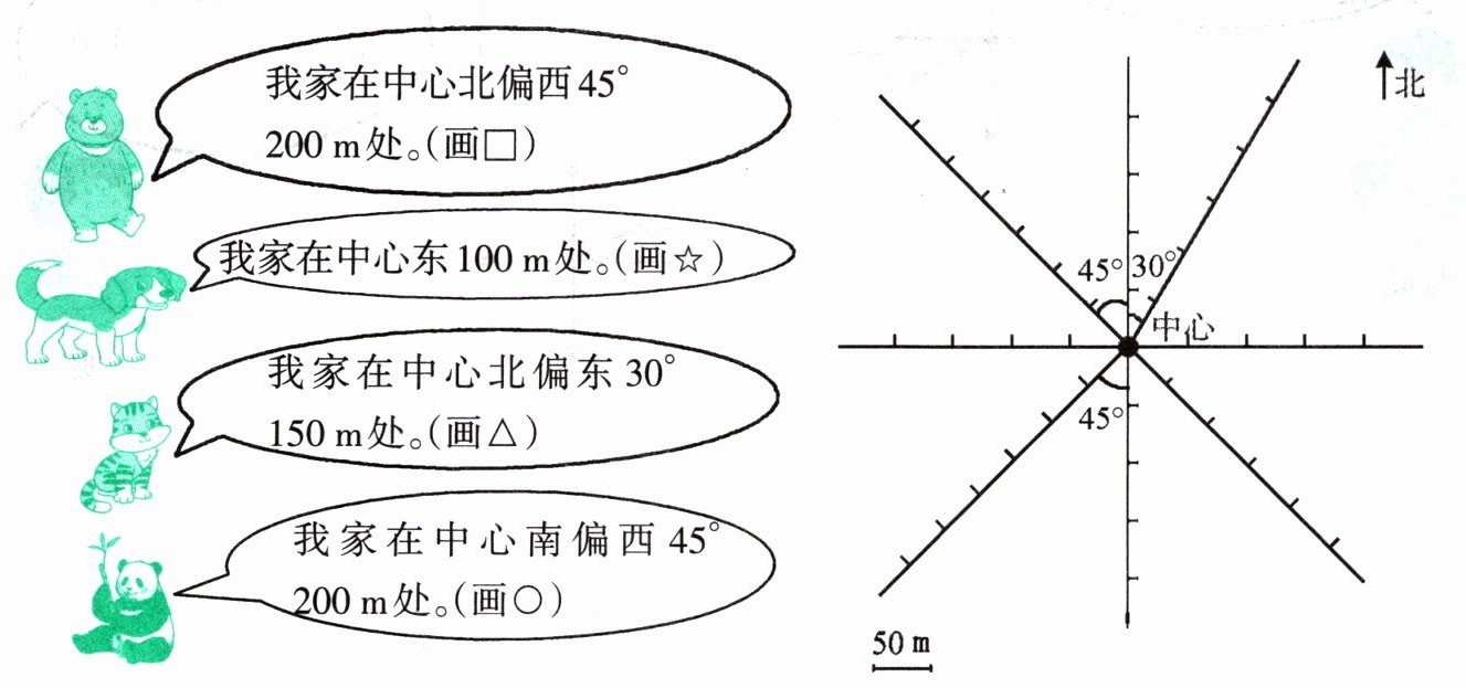 小熊家:图上距离:$200÷50=4(cm)$;画法:以中心为端点,向北偏西$45^\circ$方向画一条长度为4cm的线段,端点处画正方形;