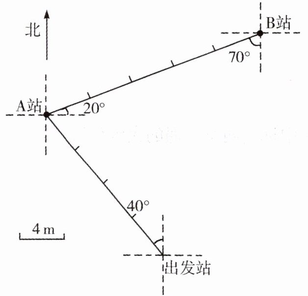 从A站出发,向东偏北20°方向行走20m到达B站。