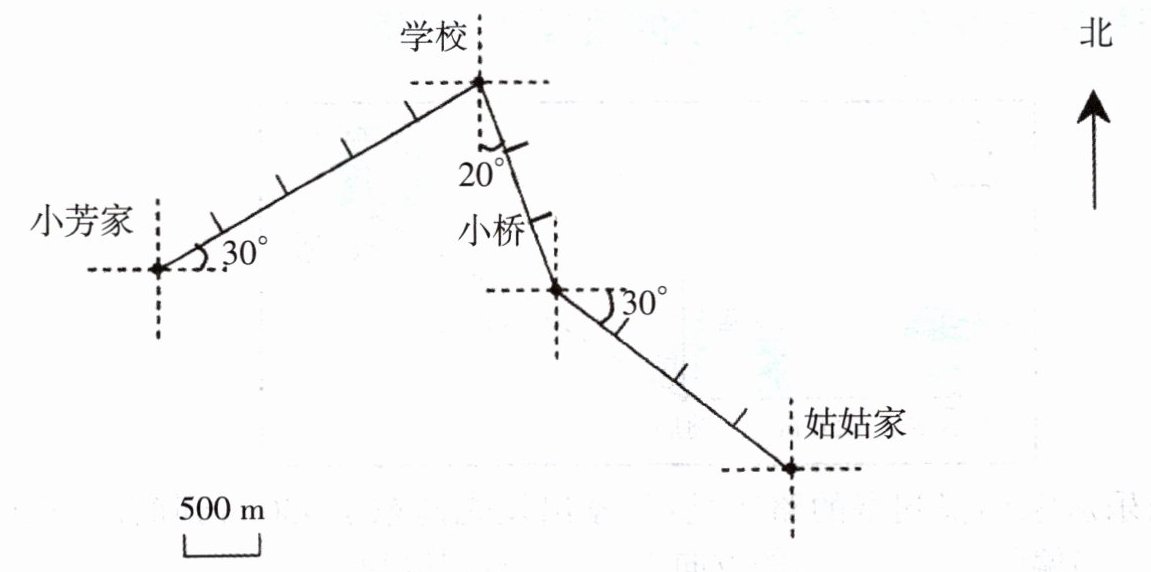 以笑笑家为观测点,学校的位置在北偏东$40^{\circ}$的方向上,距离笑笑家$900m$。