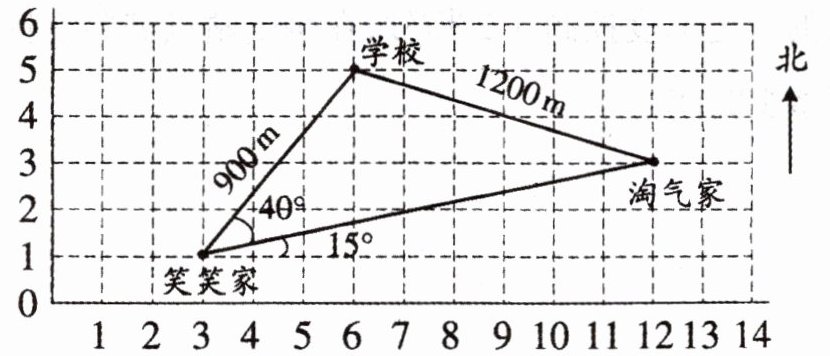 (1)观察图形可知,以笑笑家为观测点,淘气家在笑笑家东偏北$15^{\circ}$方向上。