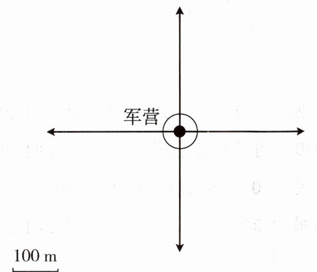 2. 从军营出发,东偏北40°方向,图上距离$500÷100 = 5$个单位长度,画出这一段路线。