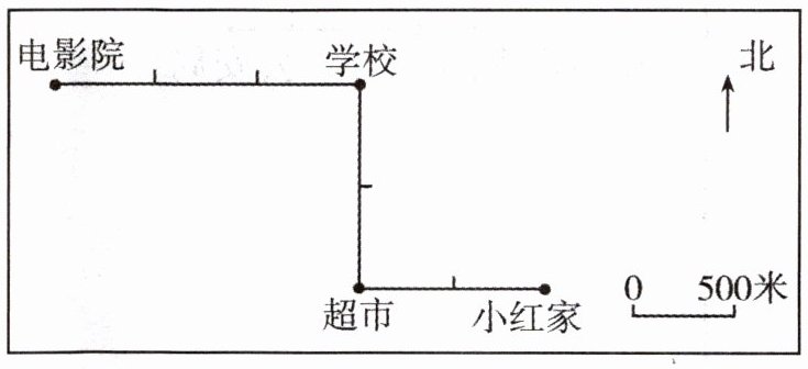 (1)从图中可知小红家到超市的距离是$2×500 = 1000$(米),超市到学校的距离是$3×500 = 1500$(米),那么小红每天从家到学校要走的路程就是小红家到超市的距离与超市到学校的距离之和。