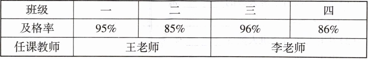 实验小学六年级共有四个班级,一、二班由王老师教,分别有60人、40人,三、四班由李老师教,两班都是50人。上学期期末检测各班成绩统计如下: