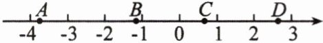 2. 如图,数轴上的点A,B,C,D分别表示有理数a,b,c,d,这四个数中,绝对值最小的是哪个数?