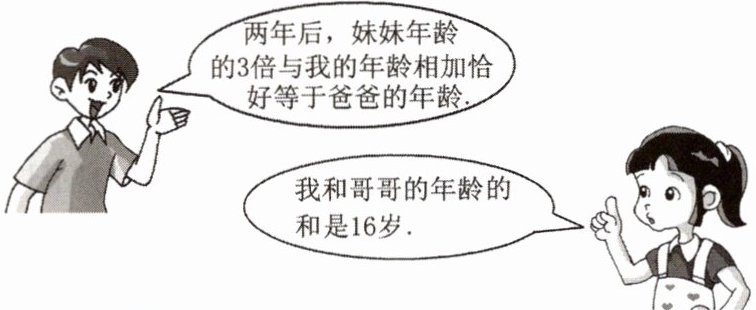 根据对话内容,请你用方程的知识帮记者求出哥哥和妹妹的年龄.