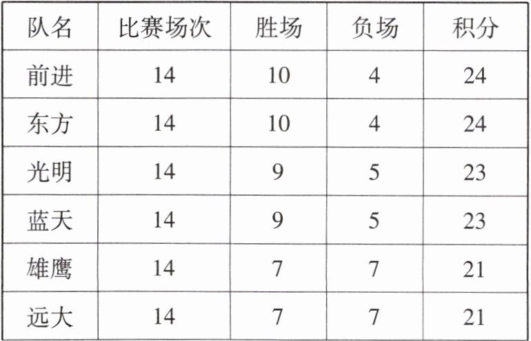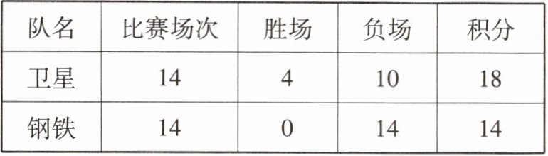 (1)设负一场积$x$分,由钢铁队(0胜14负,积分14)可得$14x=14$,解得$x=1$。设胜一场积$y$分,由前进队(10胜4负,积分24)得$10y + 4×1=24$,解得$y=2$。答:胜一场积2分,负一场积1分。