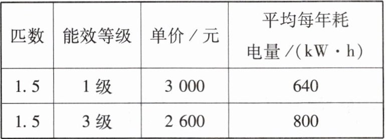 所以,若使用年限小于$5$年,购买$3$级能效空调综合费用低;若使用年限等于$5$年,购买两款空调综合费用一样;若使用年限大于$5$年,购买$1$级能效空调综合费用低。