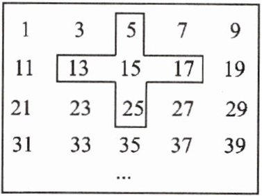 20. (10 分)下图是由 $1,3,5,7,9,…$ 按一定的规律列成的方阵,用十字图案按如图所示的方式框出 5 个数.