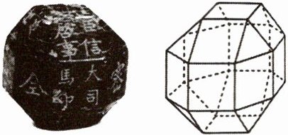 .(4) 现存于陕西历史博物馆的我国南北朝时期的官员独孤信的印章如图所示,它由 $ 18 $ 个相同的正方形和 $ 8 $ 个相同的等边三角形围成. 如果其中正方形和等边三角形的边长都为 $ a $,等边三角形的高为 $ b $,那么这个印章的表面积为