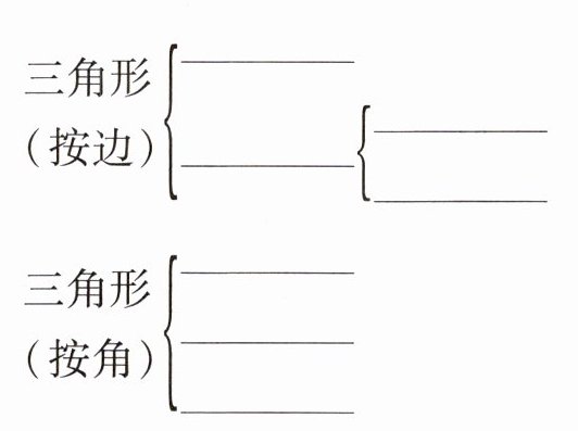 三角形(按边)$\begin{cases} 不等边三角形 \\ 等腰三角形 \begin{cases} 等边三角形 \\ 底和腰不相等的三角形 \end{cases} \end{cases} $
