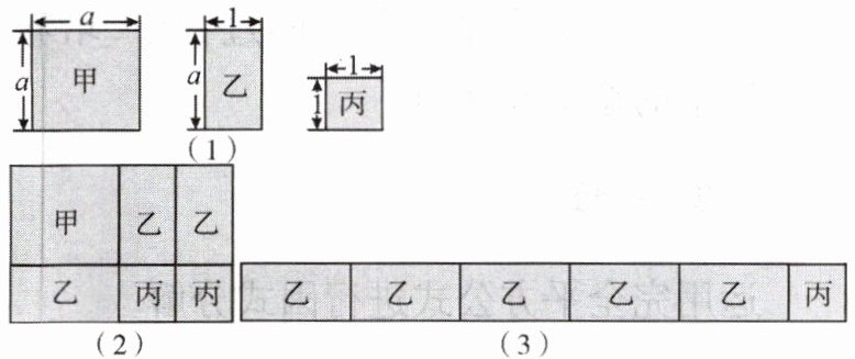 2. 现有甲、乙、丙三种矩形卡片各若干张,卡片的边长如图(1)所示($a>1$). 某同学分别用 $6$ 张卡片拼出了两个矩形(不重叠无缝隙),如图(2)和图(3),其面积分别为 $S_{1},S_{2}$.