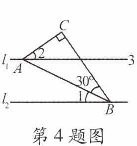 4. 将三角尺 ABC 按如图位置摆放,顶点 A 落在直线$ l_1 $上,顶点 B 落在直线$ l_2 $上,若$ l_1 // l_2,∠1 = 25°,$则 ∠2 的度数是(