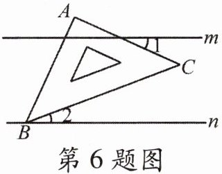 6. 如图,直线 m//n,把一块含 45°角的直角三角尺 ABC 按如图所示的方式放置,点 B 在直线 n 上,∠A = 90°。若∠1 = 25°,则∠2 的度数为(