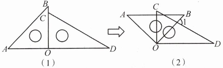 15. 一副三角尺如图(1)摆放,把三角尺 AOB 绕公共顶点 O 顺时针旋转至图(2),即 AB//OD 时,∠1 的度数为