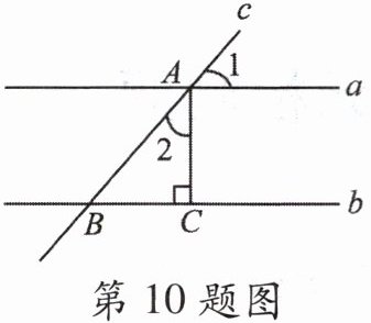 10. 如图,直线 a//b,直线 c 与直线 a,b 分别相交于点 A,B,AC⊥b,垂足为 C。若∠1 = 52°,则∠2 的度数为(