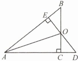 例 如图,在$△ABC$中,$AO是∠BAC$的平分线,$∠ACB= 90^{\circ}$,点$D在AC$的延长线上,$DE过点O$,且$DE⊥AB$,垂足为$E$. 请你找出图中相等的线段,并说明理由.