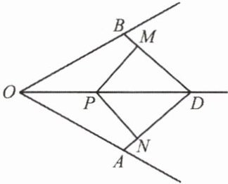点$P$在$\angle ADB$的平分线上($\angle BDO=\angle ADO$,$PD$为$\angle ADB$的平分线),$PM$是点$P$到$BD$的距离,$PN$是点$P$到$AD$的距离。