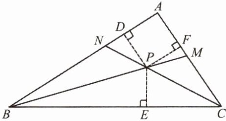 例 如图,$△ABC的角平分线BM$,$CN相交于点P$.求证:点$P到三边AB$,$BC$,$CA$的距离相等.