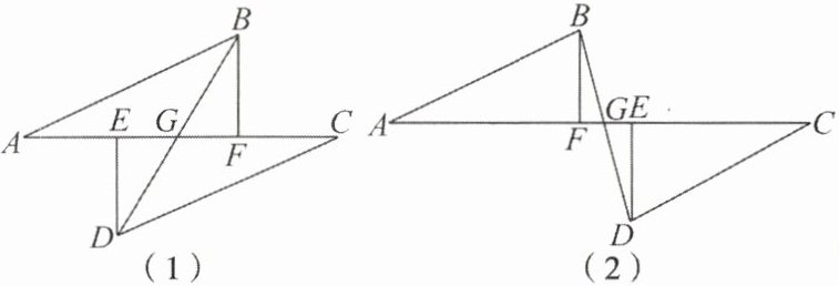 如图(1),$A$,$E$,$F$,$C$在一条直线上,$AE = CF$,过$E$,$F分别作DE⊥AC$,$BF⊥AC$,若$AB = CD$,可以得到$BD平分EF$,为什么?若将$△DEC的边EC沿AC$方向移动,变为图(2)时,其余条件不变,上述结论是否成立?请说明理由.