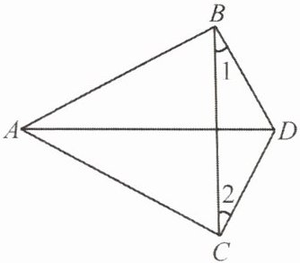 19. 如图,$ \angle ABD = \angle ACD = 90^{\circ} $,$ \angle 1 = \angle 2 $。求证:$ AD $ 平分 $ \angle BAC $。