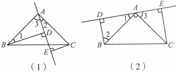 (2)当直线 $ AE $ 处于如图(2)的位置时,$ BD $,$ DE $,$ CE $ 的关系如何?请说明理由。