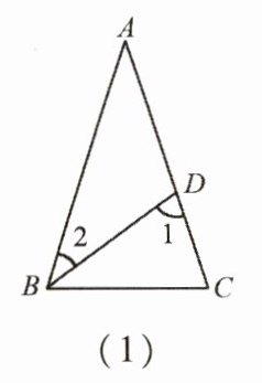 1. 如图(1),$∠A= 36^{\circ}$,$∠DBC= 36^{\circ}$,$∠C= 72^{\circ}$,分别计算$∠1$,$∠2$的度数,并说明图中有哪些等腰三角形.