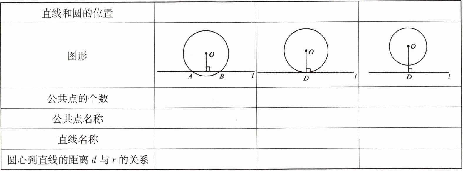 | 位置关系 | 公共点个数 | 圆心到直线距离d与半径r关系 | 图形 |