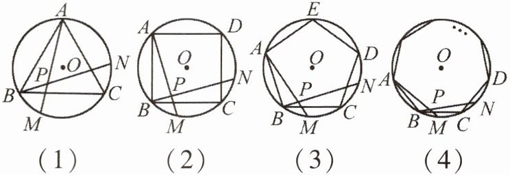 如图(1)(2)(3)(4)分别是⊙O的内接正三角形、正方形、正五边形、正n边形,点M,N分别从点B,C开始以相同的速度在⊙O上逆时针运动.