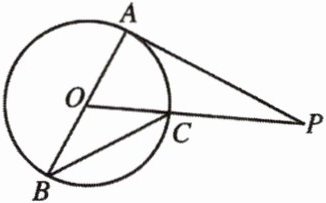例 1 如图,$ AB $ 是 $ \odot O $ 的直径,$ PA $ 切 $ \odot O $ 于 $ A $,$ OP $ 交 $ \odot O $ 于点 $ C $,连接 $ BC $. 若 $ \angle P = 30° $,求 $ \angle B $ 的度数.
