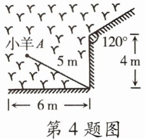 4. 如图,一根 5 m 长的绳子,一端拴在围墙墙角的柱子上,另一端拴着一只小羊 A(羊只能在草地上活动),那么小羊 A 在草地上的最大活动区域的面积是(