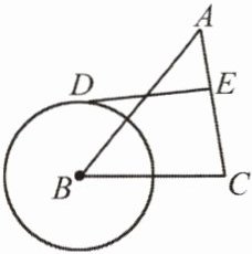 9. 如图,在△ABC 中,∠BAC = 45°,AB = $5\sqrt{2}$ cm,以 B 为圆心、3 cm 为半径作⊙B,D 是⊙B 上一动点,⊙B 的切线 DE 交 AC 于点 E,则 DE 长度的最小值为