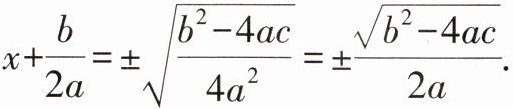 $x+\frac{b}{2a}= \pm\sqrt{\frac{b^{2}-4ac}{4a^{2}}}= \pm\frac{\sqrt{b^{2}-4ac}}{2a}$。