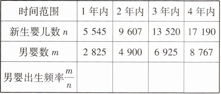 人;(2)填写上表各年的男婴出生频率 $ \frac{m}{n} $;(结果都保留三个有效数字)