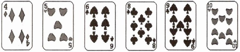 4. 从下面的 $ 6 $ 张牌中,任意抽取两张,则其点数和是奇数的概率为