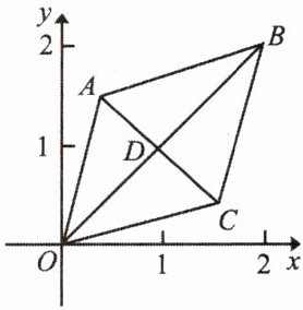 5. 如图,已知菱形 $ OABC $ 的顶点 $ O(0,0) $,$ B(2,2) $。若菱形绕点 $ O $ 逆时针旋转,每秒旋转 $ 45^{\circ} $,则第 4 秒时,菱形的对角线交点 $ D $ 的坐标为(