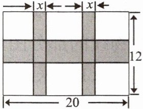 17. (8 分)如图,一幅长 20 cm,宽 12 cm 的图案,其中有一横两竖的彩条,横、竖彩条的宽度比为 $ 3:2 $。设竖彩条的宽度为 $ x $ cm,图案中三条彩条所占面积为 $ y $ $ cm^{2} $。