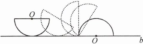 15. 如图,半径为 5 的半圆的初始状态是直径平行于桌面上的直线 $ b $,然后把半圆沿直线 $ b $ 进行无滑动滚动,使半圆的直径与直线 $ b $ 重合为止,则圆心 $ O $ 运动路径的长度等于