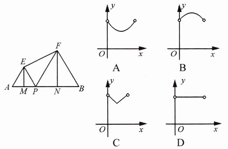 10. 如图,线段 $ AB $ 的长为 1,点 $ P $ 为线段 $ AB $ 上的一个动点($ P $ 不与 $ A $,$ B $ 重合),以 $ AP $,$ BP $ 为边在线段 $ AB $ 的同侧作正三角形 $ AEP $ 与正三角形 $ BFP $。过 $ E $ 作 $ EM\perp AP $ 于点 $ M $,过 $ F $ 作 $ FN\perp BP $。连接 $ EF $。设 $ AP $ 的长度为 $ x $,四边形 $ EMNF $ 的面积为 $ y $,则能表示 $ y $ 与 $ x $ 之间函数关系的大致图象是(