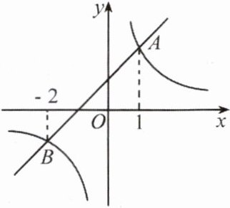 4. 如图, 一次函数 $ y_1 = k_1x + b(k_1 > 0) $ 的图象与反比例函数 $ y_2 = \frac{k_2}{x}(k_2 > 0) $ 的图象相交于 $ A, B $ 两点, 点 $ A $ 的横坐标为 $ 1 $, 点 $ B $ 的横坐标为 $ -2 $. 当 $ y_1 < y_2 $ 时, $ x $ 的取值范围是(