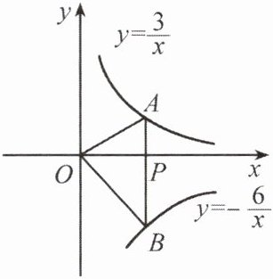 2. 如图,过 $ x $ 轴上任意点 $ P $ 作 $ y $ 轴的平行线,分别与反比例函数 $ y = \frac{3}{x}(x > 0) $,$ y = - \frac{6}{x}(x > 0) $ 的图象交于 $ A $ 点和 $ B $ 点. 连接 $ AO $,$ BO $,则 $ \triangle ABO $ 的面积为