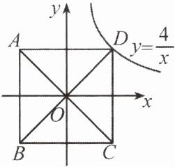 1. 以正方形 $ ABCD $ 两条对角线的交点 $ O $ 为原点,建立如图所示的平面直角坐标系,反比例函数 $ y = \frac{4}{x} $ 的图象经过点 $ D $,则正方形 $ ABCD $ 的面积为(