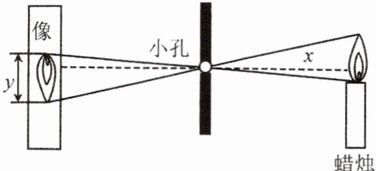 如图,根据小孔成像的科学原理,当像距(小孔到像的距离)和物高(蜡烛火焰高度)不变时,火焰的像高 y(单位:cm)是物距(小孔到蜡烛的距离)x(单位:cm)的反比例函数,当 x = 6 时,y = 2.