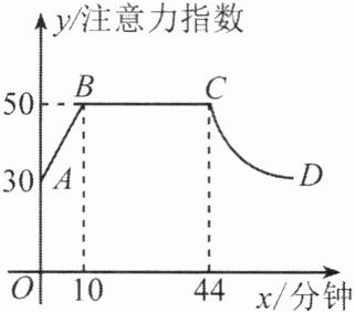 2. 一般情况下,中学生完成数学家庭作业时,注意力指数随时间 $ x $(单位:分钟)的变化规律如图所示(其中 $ AB,BC $ 为线段,$ CD $ 为双曲线的一部分).