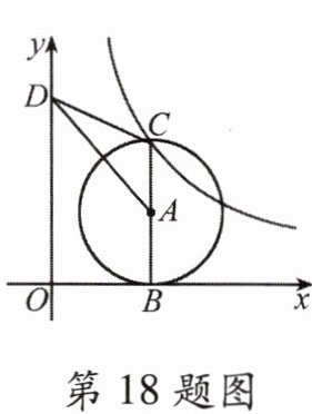 18. 如图,在平面直角坐标系中,$ \odot A $ 与 $ x $ 轴相切于点 $ B $,$ CB $ 为 $ \odot A $ 的直径,点 $ C $ 在函数 $ y = \frac{k}{x}(k > 0,x > 0) $ 的图象上,$ D $ 为 $ y $ 轴上一点,$ \triangle ACD $ 的面积为 6,则 $ k $ 的值为