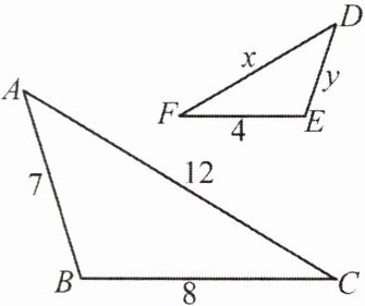 4. 如图,$\triangle ABC与\triangle DEF$相似,求$x$,$y$的值。