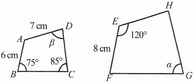 3. 如图,四边形$ABCD与四边形EFGH$相似,求角$\alpha$,$\beta的大小和边EH$的长度。